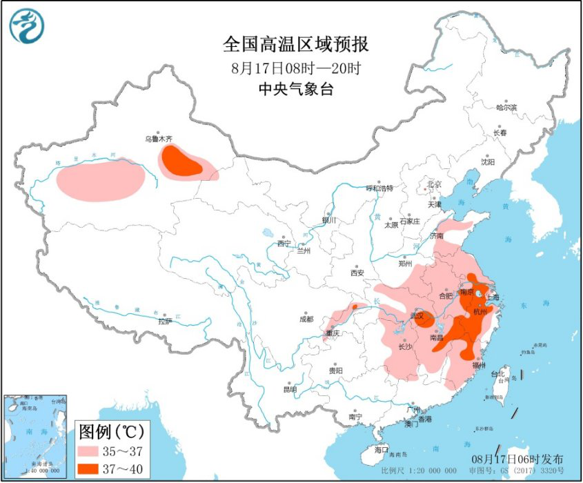 未來(lái)三天,黃淮南部、江淮、江漢、江南、四川盆地東部、新疆南疆盆地等地有35℃以上的高溫天氣,部分地區(qū)最高溫度可達(dá)37~39℃,局地可達(dá)40℃以上。預(yù)計(jì)8月17日白天,新疆南疆盆地、山東中南部、河南南部、安徽、江蘇、上海、湖北北部和中東部、湖南中東部、江西大部、浙江大部、福建大部、重慶大部等地有35℃以上高溫天氣,其中,新疆南疆盆地、安徽南部、江蘇南部、湖北東南部、江西東北部、浙江中西部、福建西北部、重慶北部等地的部分地區(qū)最高氣溫37~39℃。中央氣象臺(tái)8月17日06時(shí)繼續(xù)發(fā)布高溫黃色預(yù)警。