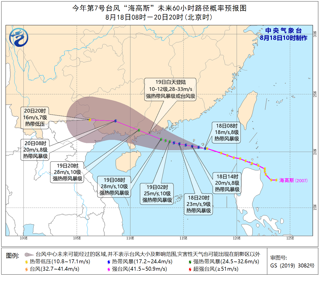 預(yù)計, “海高斯”中心將以每小時20-25公里的速度向西偏北方向移動,強度繼續(xù)加強,逐漸向廣東省西部沿海靠近,并將于19日白天在廣東臺山到湛江一帶沿海登陸(28-33米/秒,10-12級,強熱帶風(fēng)暴級或臺風(fēng)級)。登陸以后向偏西方向移動,強度逐漸減弱。