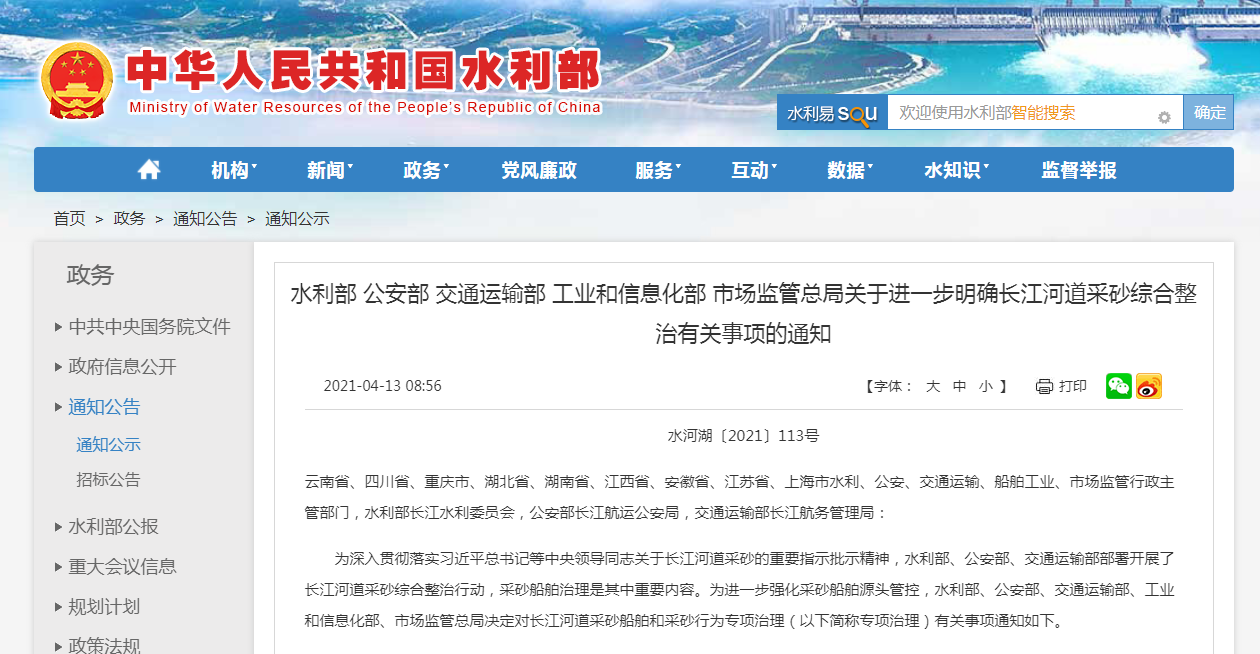 五部委聯(lián)合部署開展長(zhǎng)江河道采砂船舶和采砂行為專項(xiàng)治理(來(lái)源:水利部官網(wǎng))