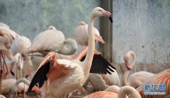 北京動(dòng)物園內(nèi)的火烈鳥在室內(nèi)乘涼(6月28日攝)。