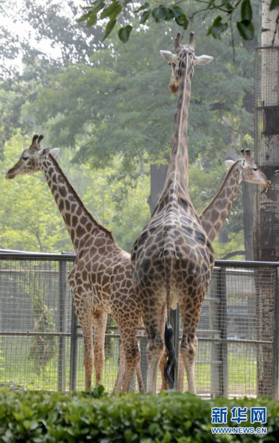 北京動(dòng)物園的長頸鹿在樹下乘涼(6月28日攝)。