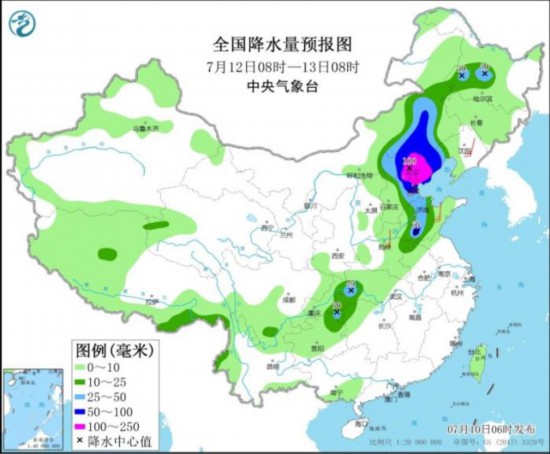 7月12日8時(shí)至13日8時(shí),內(nèi)蒙古中東部、黑龍江西南部、遼寧西部、華北中東部、黃淮東部、重慶東部、湖北西南部等地部分地區(qū)有中到大雨,其中,內(nèi)蒙古東南部、遼寧西南部、河北東北部、北京大部、天津大部等地部分地區(qū)有暴雨或大暴雨(100~180毫米)。遼寧、華北東部、黃淮等地部分地區(qū)有4~6級(jí)風(fēng)。