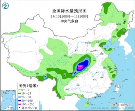 全國(guó)降水量預(yù)報(bào)圖(7月10日8時(shí)-11日8時(shí))