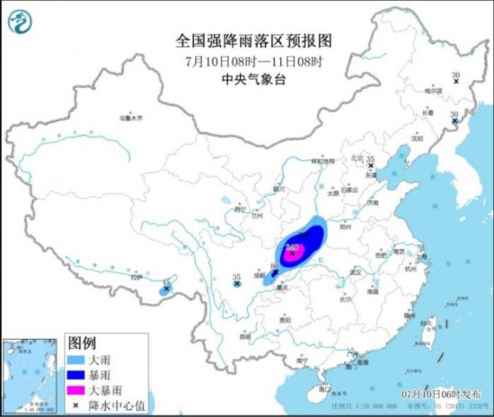 7月10日08時(shí)至11日08時(shí),四川盆地和川西高原南部、陜西中南部、山西西南部、河南西部、西藏東部、云南西部以及內(nèi)蒙古東北部、東北地區(qū)東部、河北東北部、山東北部等地部分地區(qū)有中到大雨,其中,陜西南部、河南西部、湖北西北部、四川盆地東北部等地部分地區(qū)有暴雨或大暴雨(100~240毫米)。內(nèi)蒙古中西部等地部分地區(qū)有4~5級(jí)風(fēng)。