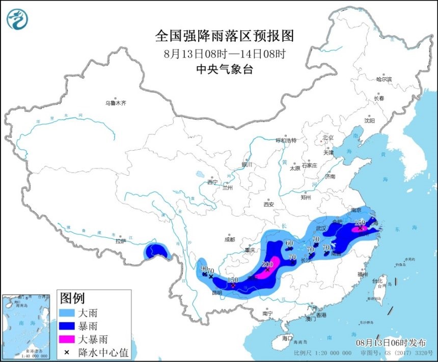人民網(wǎng)北京8月13日電 (記者李楠樺)據(jù)中國(guó)氣象局消息,過(guò)去一天,西南地區(qū)東部至長(zhǎng)江中下游地區(qū)出現(xiàn)強(qiáng)降雨過(guò)程,云南、四川、重慶、湖南、湖北、安徽、浙江等地部分地區(qū)出現(xiàn)大暴雨,其中湖北孝感局地特大暴雨(268.2毫米)。預(yù)計(jì)今天,強(qiáng)降雨將繼續(xù)發(fā)威影響長(zhǎng)江中下游及重慶、貴州等地,明日(14日)起,雨帶逐漸南壓,江南中北部有中到大雨,局地暴雨。