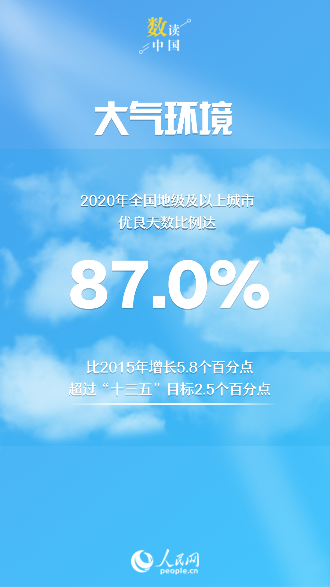 在大氣環(huán)境質(zhì)量方面,2020年全國地級(jí)及以上城市優(yōu)良天數(shù)比例達(dá)到了87%,比2015年增長了5.8個(gè)百分點(diǎn),超過“十三五”目標(biāo)2.5個(gè)百分點(diǎn)。PM2.5未達(dá)標(biāo)地級(jí)及以上城市平均濃度達(dá)到了37微克/立方米,比2015年下降了28.8%,也超過“十三五”目標(biāo)10.8個(gè)百分點(diǎn)。
