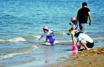 在天津市濱海新區(qū)的人工沙灘,小朋友體驗“趕海拾貝”。新華社發(fā)