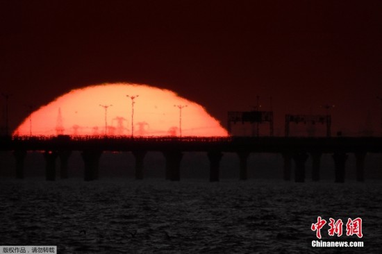 當(dāng)?shù)貢r間2月6日,科威特謝赫賈比爾堤道現(xiàn)絕美夕陽景觀,落日余暉映紅天際。
