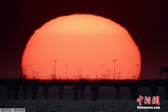 當?shù)貢r間2月6日,科威特謝赫賈比爾堤道現(xiàn)絕美夕陽景觀,落日余暉映紅天際。