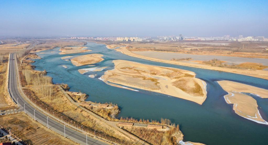 這是2022年12月29日拍攝的位于寧夏中衛(wèi)市境內(nèi)的黃河景觀(無人機(jī)照片)。新華社記者 馮開華 攝