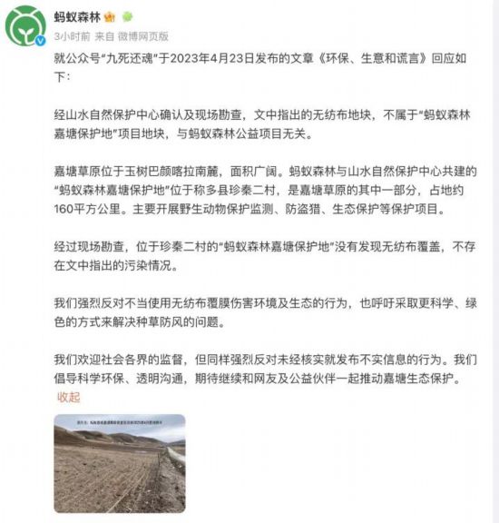 4月23日,自媒體發(fā)布的《環(huán)保、生意和謊言》文章稱,螞蟻森林嘉塘保護(hù)區(qū)地塊存在大量未回收的無紡布覆膜,污染當(dāng)?shù)赝恋丨h(huán)境。螞蟻森林官方微博發(fā)布2023年4月現(xiàn)場(chǎng)勘查圖片回應(yīng):經(jīng)山水自然保護(hù)中心確認(rèn)及現(xiàn)場(chǎng)勘查,文中指出的無紡布地塊,不屬于“螞蟻森林嘉塘保護(hù)地”項(xiàng)目地塊,與螞蟻森林公益項(xiàng)目無關(guān)。